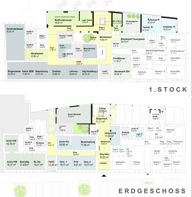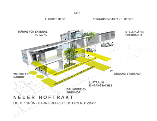 WBW Stadtamt, Schrems 3.PREIS Nutzfläche: 1500m² Aufgabenstellung: Umbau des Stadtamtes in ein zeitgemässes Verwaltungszentrum, Umsetzung bei laufendem Betrieb, barrierefreie Erschließung der Gebäude EU-weiter, offener, einstufiger Realisierungswettbewerb Funktionsbereiche: Direktion, Finanzverwaltung, Bürgerservice Meldewesen, Bauhof, Polizeiinspektion, Archiv