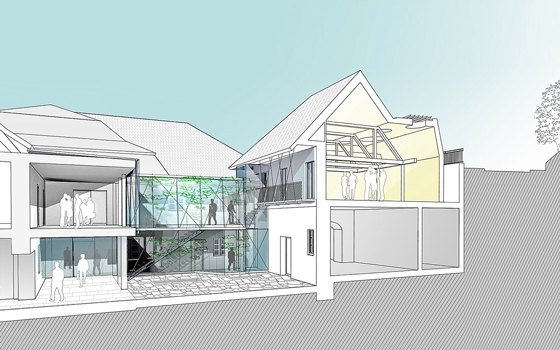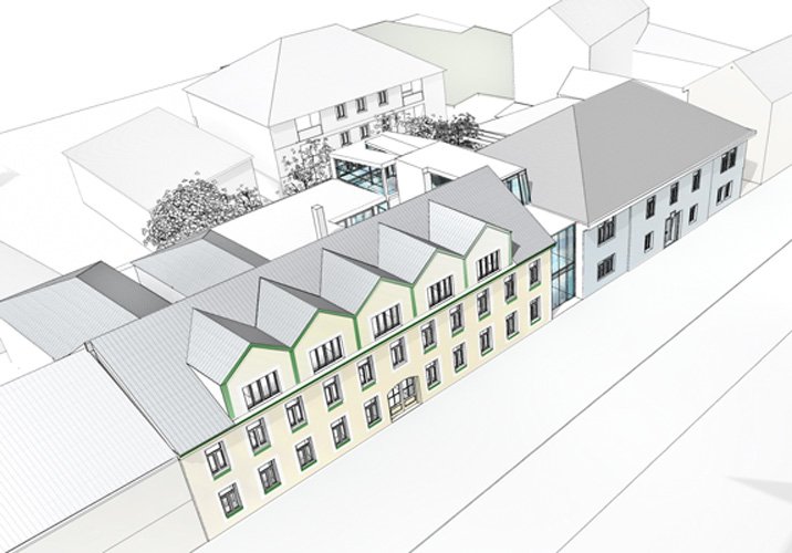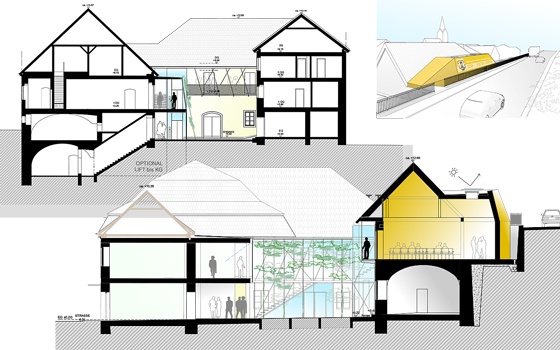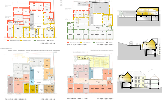 WBW Sanierung, Umbau Rathaus Persenbeug Nutzfläche: 1800m² Aufgabenstellung: Sanierung , Neuordnung (barrierefrei) und Erweiterung um einen Veranstaltungssaal für ca 100 Personen Geladenes, einstufiges Planungsauswahlverfahren Konzept: keine massiven Eingriffe in die historische Substanz, Barrierefreiheit durch Addition eines gläsernen Baukörpers im Hof, Erweiterung nach Norden statt in den denkmalgeschützten Hof - dadurch Gewinn einer neuen Fassade mit Werbewirksamkeit (Veranstaltung, Rathaus)