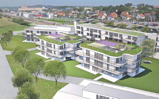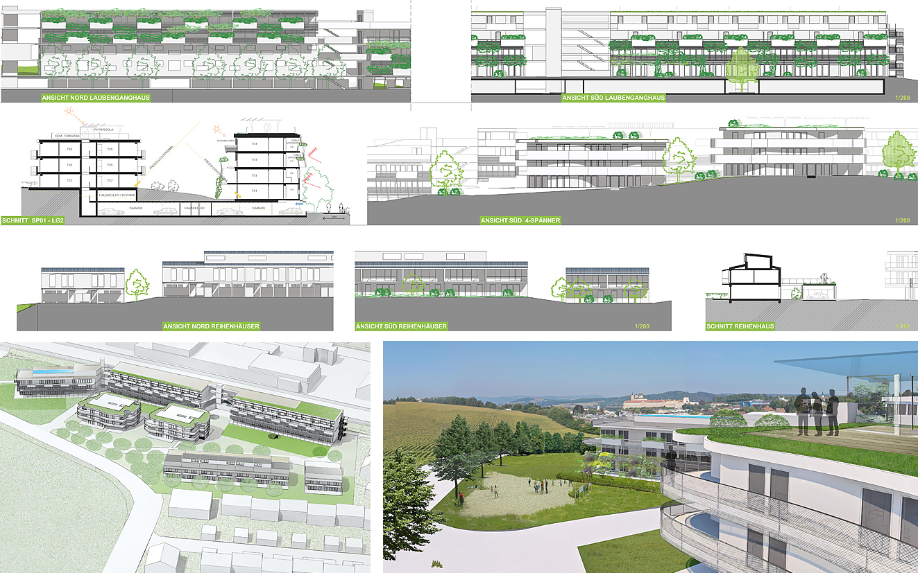 WBW Wohnhausanlage Melk 'Stiftsblick' Nutzfläche: 6000m² Aufgabenstellung: Errichtung einer Wohnhaus- und Reihenhausanlage mit 80 WE, Randbebauung als baulicher Lärmschutz (BKL IV), Energiekennzahl Rk: 20 kWh/m²a Geladenes, einstufiges Planungsauswahlverfahren Die Mitte des Grundstücks wird als parkartige Ruhezone mit nur zwei Solitärgebäuden und einem Grünraum mit hohem Freizeitwert freigehalten. Die Rationalität der Modulbauweise wird durch sorgfältige Höhenstaffelung (Stiftsblick) abwechslungsreiche Grünelemente (natürl. Sonnenschutz) vielfältige Dachnutzungen und die organisch geschwungenen Punkthäuser im Park ('Baumhaus') konterkariert.